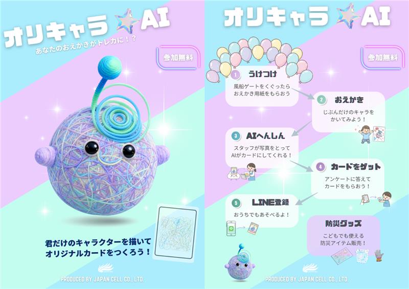 ジャパンセルでは自分で描いた絵を生成AIがオリジナルのトレカ画像にしてくれる楽しい体験ができます。アンケートに答えて頂ければ画像が印刷された本物のカードをその場で差し上げます。小さなお子様の落書きでもOK!体験無料!